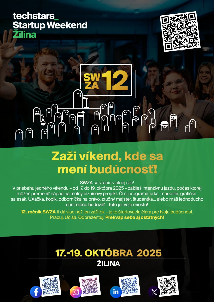 Dobrý deň, Dovoľte nám osloviť Vás v mene organizačného tímu Startup Weekend Žilina, ktorý sa uskutoční už po 12-krát 17.–19. októbra 2025 v Žiline. Radi by sme Vám predstavili túto jedinečnú príležitosť pre študentov, a zároveň Vás požiadali o podporu pri zdieľaní tejto udalosti medzi študentami, prípadne pedagógmi Vašej školy.